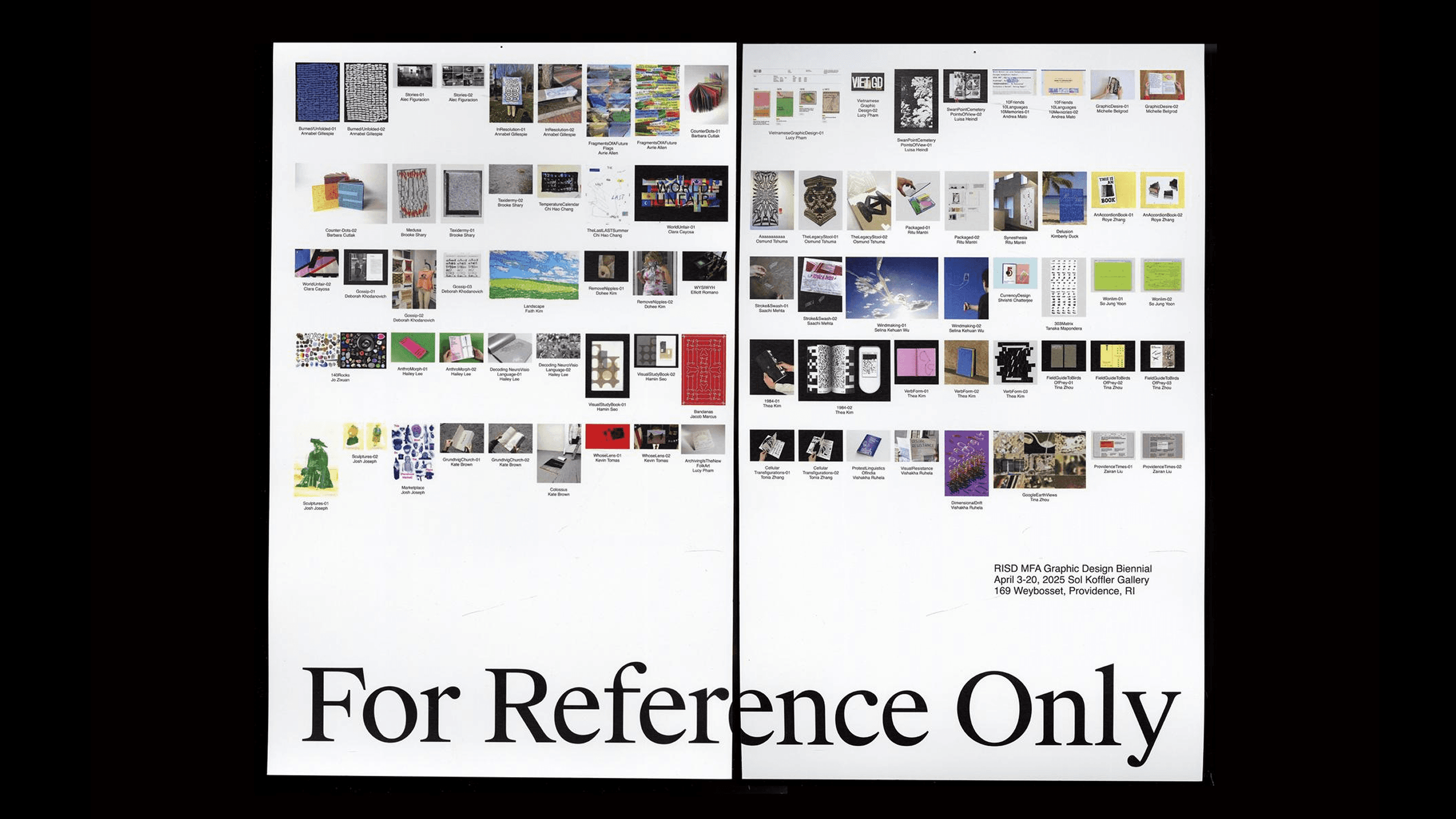 ¹For Reference Only explores the uncertain trajectories of design work once it enters circulation. Featuring 49 works from current and past students of the RISD Graphic Design MFA Program, the exhibition interrogated the fate of design artifacts—whether they are engaged with meaningfully or relegated to fleeting digital consumption and archival obscurity. The show invited visitors to consider how design is encountered, remembered, and recontextualized over time, asking whether reference itself is a form of life or a kind of slow erasure.